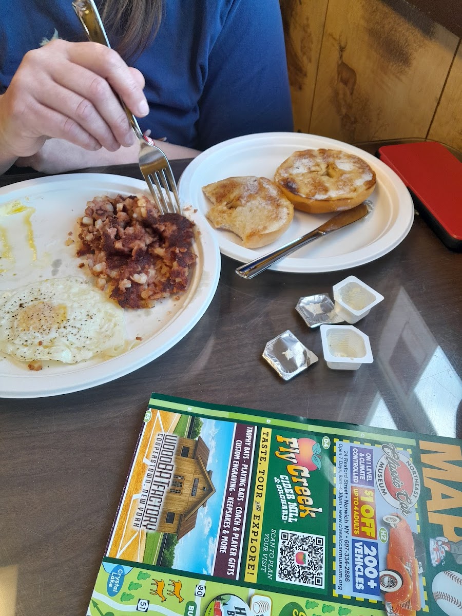 Go here, the food is excellent. Diner style breakfast. Junior Hit is exactly that - a hit that has a little bit of all the breakfast bests! Get a cinnamon roll to take away and heat for 20-30 seconds in your microwave the next morning. Thank me later.